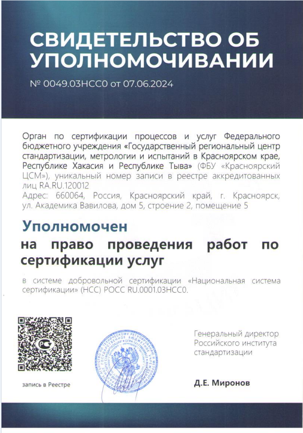 Свидетельство об уполномочивании на право проведения работ по сертификации услуг