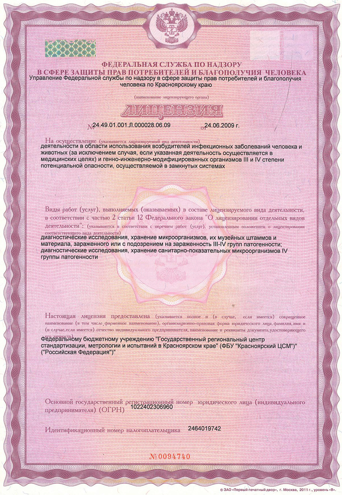 Лицензия на осуществление деятельности в области использования возбудителей инфекционных заболеваний человека и животных