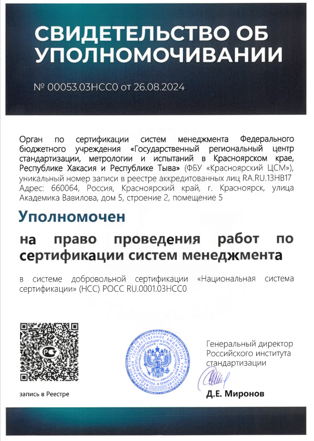 Свидетельство об уполномочивании на право проведения работ по сертификации систем менеджмента