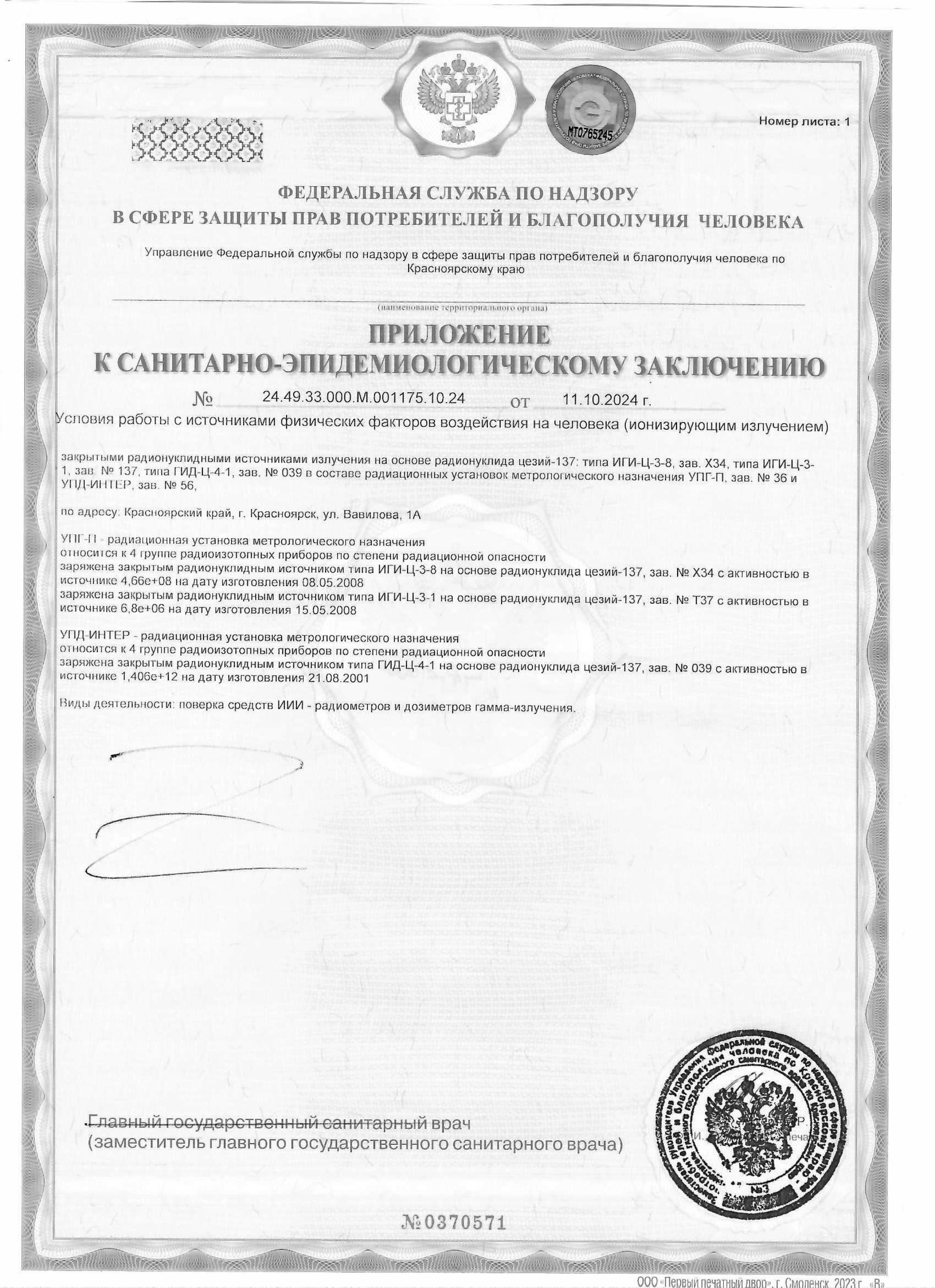 Приложение к санитарно-эпидемиологическому заключению на условия работы с источниками физических факторов воздействия на человека (ионизирующим излучением)