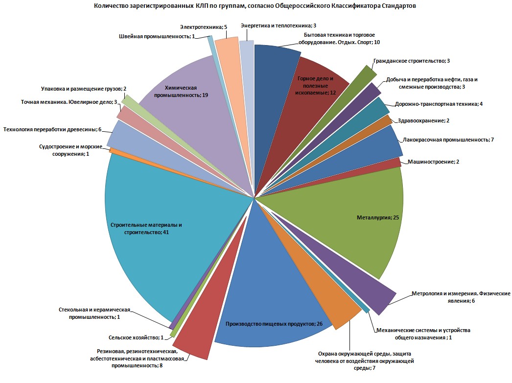 На диаграмме представлены данные за 2015 г. Количество зарегистрированных КЛП по группам, согласно Общероссийского Классификатора стандартов.