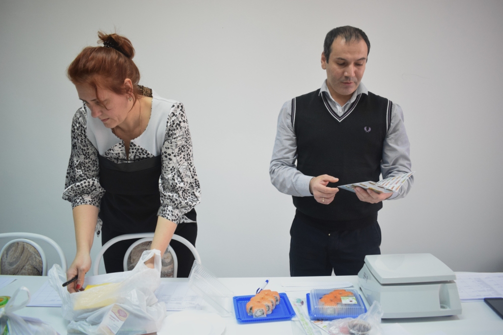 Специалисты Центра заказали роллы «Филадельфия»   13 компаниям, занимающихся их изготовлением  и   доставкой.  Изначально планировалось закупить продукцию в  15-ти компаниях,  однако в двух из - них не ответили на звонки экспертов. Напомним, что заказ производился на конкретное время,  за сутки до мероприятия. В итоге,  к определенному времени доставили продукцию  12  компаний («Мир суши», «Время суши», «Суши-рыба», «Фудзи», «Венеция», «Суши-Терра», «Якитория», «Оригами», «ТАКИ», «Яр Суши», «Цунами» и «Суши Куб»). Компания «СЭН-ТО», в день доставки, отказалась от исполнения заказа  – по причине поломки автомобиля. В течение часа специалисты Центра  в присутствии представителей средств массовой информации принимали роллы.  Каждая фирма  доставила согласно заказу  по два набора  роллов  «Филадельфия»,  их цена составляет от 531 до 738 рублей.  Один  набор  сразу помещали в сумку - холодильник для направления в испытательный центр  и проведения исследований по микробиологическим  показателям. Во втором наборе  эксперты   оценивали  потребительские свойства роллов (внешняя привлекательность, консистенция) и  определяли  массу нетто продукции. Кроме вышеуказанных показателей  также учитывалось наличие сопутствующих  продуктов  (соуса, васаби, имбиря) и товаросопроводительной  документации -   товарных чеков и  необходимой информации для потребителя. Как оказалось,   у  большинства наборов закупленной продукции  отсутствует маркировка. Лишь у одного  из соусов на упаковке была указана дата изготовления.