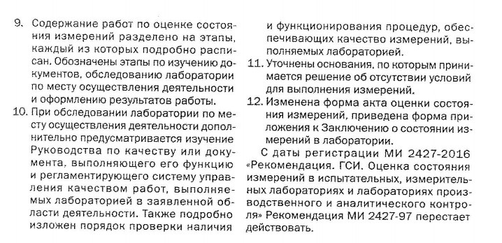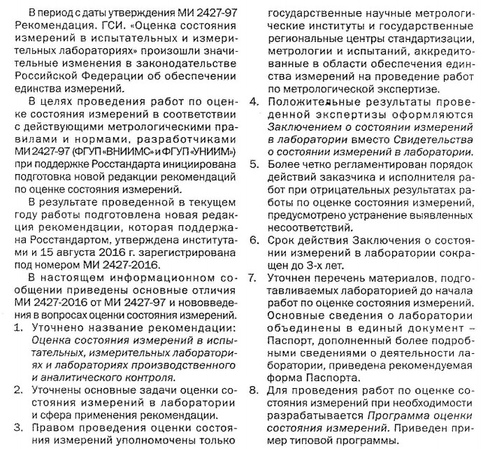 зарегистрированная ФГУП «ВНИИМС» МИ 2427-2016 «Рекомендация. Государственная система обеспечения единства измерений. Оценка состояния измерений в испытательных, измерительных лабораториях и лабораториях производственного и аналитического контроля». Документ выпущен взамен МИ 2427-97 «Рекомендация. Государственная система обеспечения единства измерений. Оценка состояния измерений в испытательных и измерительных лабораториях».