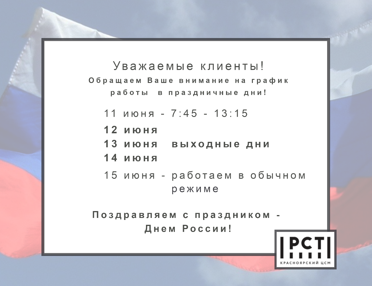 Режим работы ФБУ "Красноярский ЦСМ" в праздничные и предпраздничные дни 11,12,13,14 июня